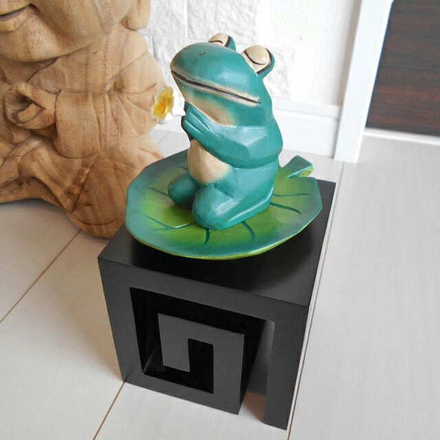 蓮の葉の上のお祈りかえる♪ かえる カエル 蛙 縁起物 ロータス 蓮 オブジェ かえるの置物 木彫りの置物 置物 アジアン雑貨 バリ雑貨