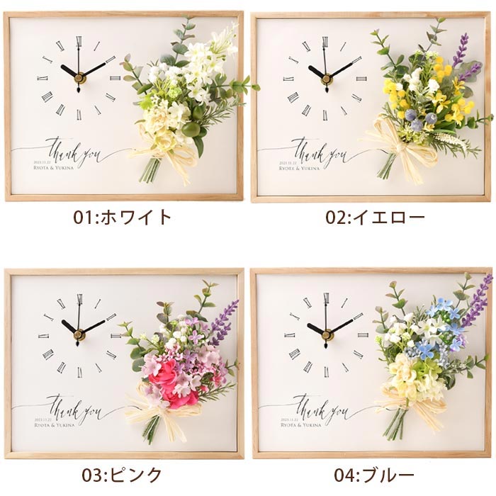 お届けの内容 ・ミニブーケ付時計 ・ゴム付きリボン ・スタンド用ウッドスティック ・単三形乾電池1本 サイズ 210×265×30mm 納期 通常10営業日で発送(土日祝のぞく) ※ただし、お支払いが銀行振込の場合はご入金確認後の発送となります ※お急ぎの方は、特急オプション(税別1,500円)をあわせてご注文ください お支払い方法名入れ商品につき、「代金引換」でのお支払いはお受け出来かねます ご注文に際して挙式日、お名前については、ご注文画面の通信欄にご記入ください ⇒ 名入れについて(必ずお読みください) 挙式日以外の日付を印刷ご希望の場合、通信欄にご記入下さい フラワーアレンジについて アーティフィシャルフラワーは輸入品のため写真とは若干異なる可能性がございますので予めご了承ください 注意事項 ※お二人のお名前と挙式日が入る商品のためご注文後のキャンセルはお受けできません。