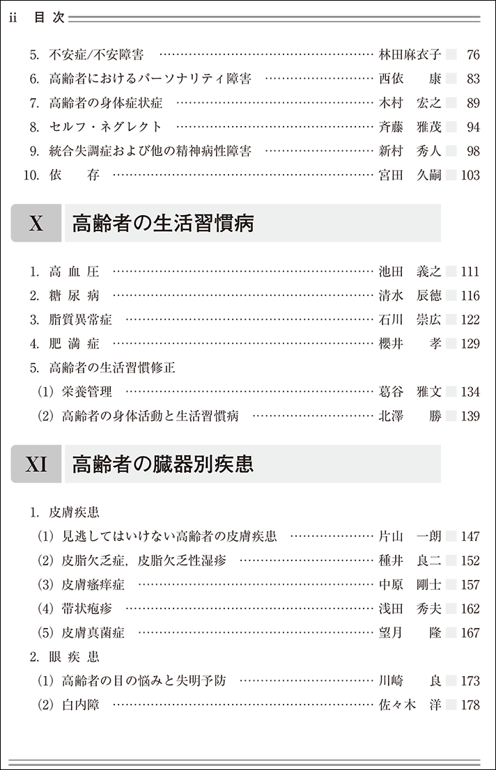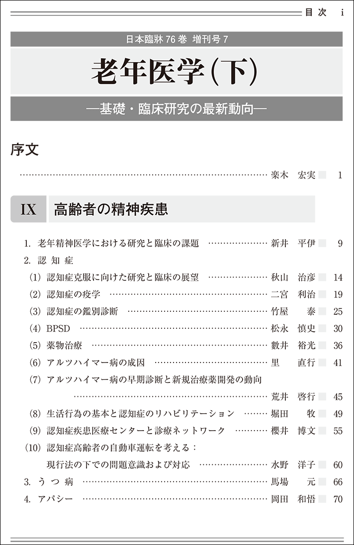 [老年医学]シリーズ ・老年医学(上):老年医学・老化研究の展望 / 老化の基礎研究 …ほか ・老年医学(下):高齢者の精神疾患 / 高齢者の生活習慣病 …ほか [増刊・別冊]2018年 ・1月発行(増刊1):実施診療のための最新認知症学 ・3月発行(増刊2):婦人科がん ・4月発行(増刊3):炎症性腸疾患 ・5月発行(増刊4):パーキンソン病(第2版) ・6月発行(増刊5):老年医学(上) ・7月発行(増刊6):血管炎(第2版) ・8月発行(増刊7):老年医学(下) ・9月発行(別冊1):内分泌症候群(第3版)I ・10月発行(増刊8):食道癌(第2版) ・11月発行(別冊2):内分泌症候群(第3版)II ・12月発行(増刊9):心不全(第2版)上 日本臨牀 76巻増刊号7(通巻1148号) 老年医学(下) —基礎・臨床研究の最新動向— ◇序 文 IX.高齢者の精神疾患 1.老年精神医学における研究と臨床の課題 2.認知症 3.うつ病 4.アパシー 5.不安症/不安障害 6.高齢者におけるパーソナリティ障害 7.高齢者の身体症状症 8.セルフ・ネグレクト 9.統合失調症および他の精神病性障害 10.依存 X.高齢者の生活習慣病 1.高血圧 2.糖尿病 3.脂質異常症 4.肥満症 5.高齢者の生活習慣修正 XI.高齢者の臓器別疾患 1.皮膚疾患 2.眼疾患 3.耳鼻咽喉疾患 4.歯科・口腔疾患 5.呼吸器疾患 6.循環器疾患 7.消化器疾患 8.腎疾患 9.婦人科疾患 10.泌尿器疾患 11.整形外科疾患 12.免疫疾患 13.神経疾患 14.感染症 15.内分泌疾患 16.血液疾患 XII.高齢者の手術 1.老年医学的な術前評価の有用性 2.周術期管理 3.高齢者の麻酔 XIII.高齢者の救急医療 1.高齢者の救急医療の現状と課題 2.意識障害 3.痙攣・行動異常 4.入浴中の事故 5.本邦における高齢者の熱中症 6.低体温症、凍瘡・凍傷 XIV.高齢者のリハビリテーション 1.高齢者のリハビリテーションの特徴 2.高齢者の理学療法:現状と展望 3.認知症高齢者に対する人間作業モデルを用いたアプローチ 〜意味のある作業の提供が認知症者を変える〜 4.言語聴覚療法 5.ロボットと転倒予防リハビリテーション 6.高齢者介護:福祉用具と介護 XV.老年看護学 1.老年看護学を老年医学・高齢者診療に生かす 2.高齢者の生活を支えるが重視される背景と老年看護学の方向性 3.さまざまな健康状態に応じた高齢者の看護 4.多様な生活の場で展開する高齢者への看護 5.高齢者に特有な疾患への看護におけるアセスメントとケア 6.高齢者に特有な症状・障害への看護におけるアセスメントとケア XVI.学際的立場からの高齢者医療・介護 1.高齢者の介護とは 2.これからのケアマネジャー 3.地域における高齢者ケア 4.老年社会科学を老年医学・高齢者診療に生かす