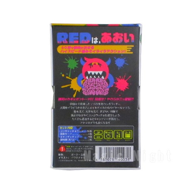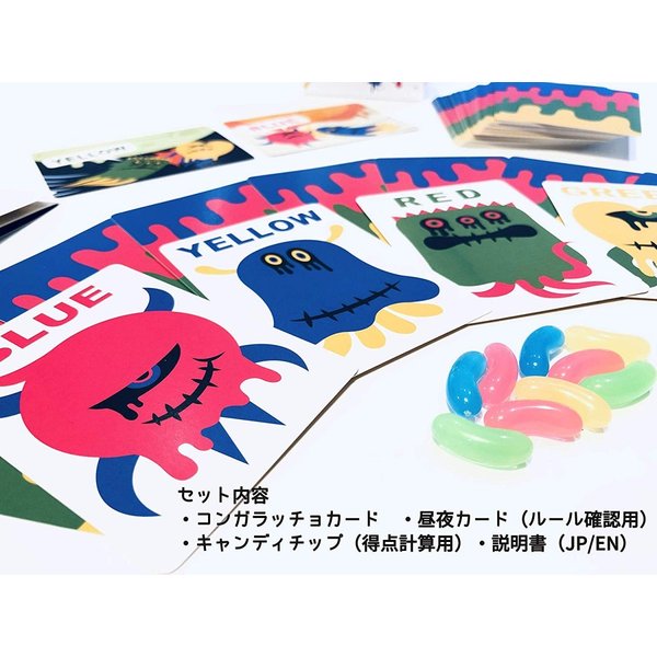 たくさん退治するとキャンディーが貰えて、アタマのデキも良くなるぞ! ◆内容◆ コンガラッチョカード:48枚、昼夜カード:4枚、キャンディチップ:9個、説明書(英/日) パッケージサイズ:12.5x7.8x5.0cm プレイ人数:2〜4人 プレイ時間:約10分 推奨年齢:6歳以上 メーカー:ガーター出版 ◆商品説明◆ キーワードは『スピード×色×混乱』! あべこべな色がハイスピードに交差するパニックバトルです。