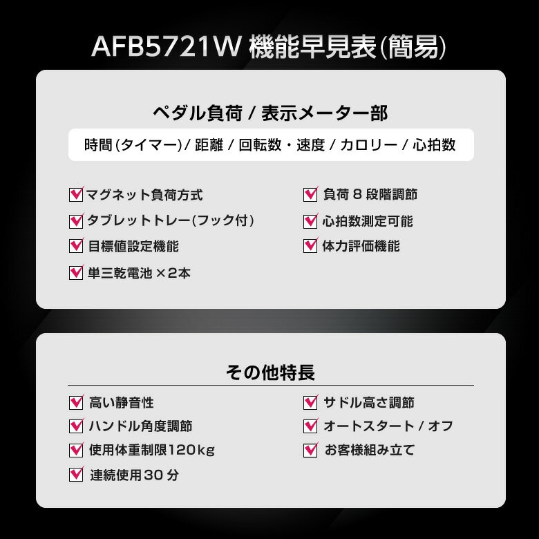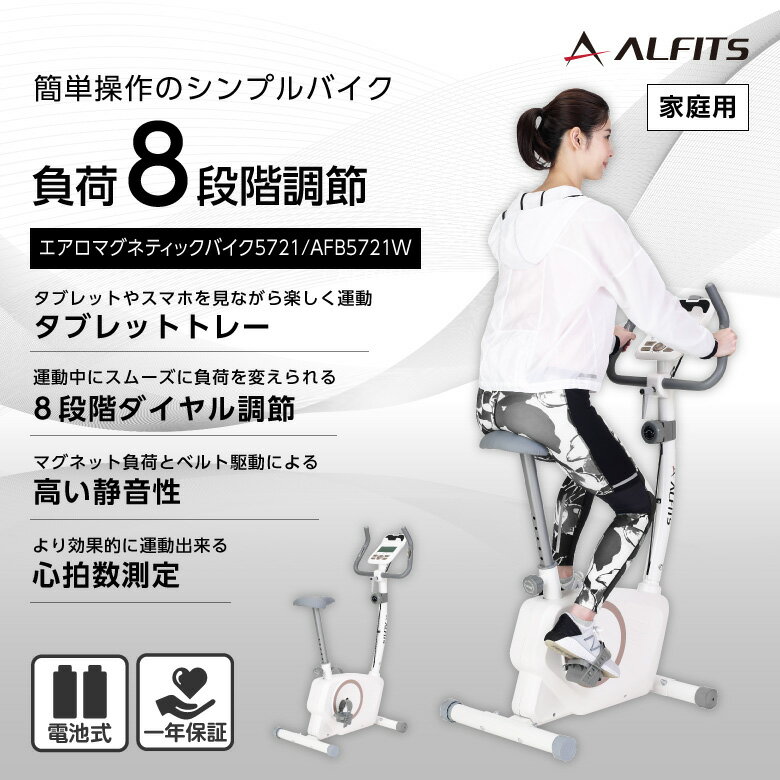 製品名 エアロマグネティックバイク5721 型番 AFB5721W 製品サイズ W505 × D850 × H1,205mm 梱包サイズ W280 × D745 × H540mm 重量 ■本体:約20.5kg■梱包:約23.5kg 材質 スチール/ABS/PS/PU/PP/PVC 使用制限体重 120kg 連続使用時間 30分 JAN 4969182517590 メーカー保証 ご購入日より1年間 商品説明 ■ペダル負荷8段階(手動マグネット負荷方式)■サドル高さ調節可能■サドル高さ:L675〜H905mm(9段階)■心拍数測定機能搭載■体力評価機能搭載■目標設定機能■電源:単3乾電池×2本■タブレットトレー付(フック付)■ペダルバンド付■移動用キャスター付■オートスタートとオートパワーオフ機能■適応身長(目安):約150〜180cm 広告文責 アルインコ株式会社TEL:06-7636-2351 メーカー(製造)・輸入者名 アルインコ株式会社 区分 健康器具 生産国 中国 在宅勤務 巣ごもり ウイルス対策 自宅トレーニング 休校中に こもりきり ダイエット テレワーク ストレス発散 セルフメンテナンス※本機の連続使用時間は30分です。