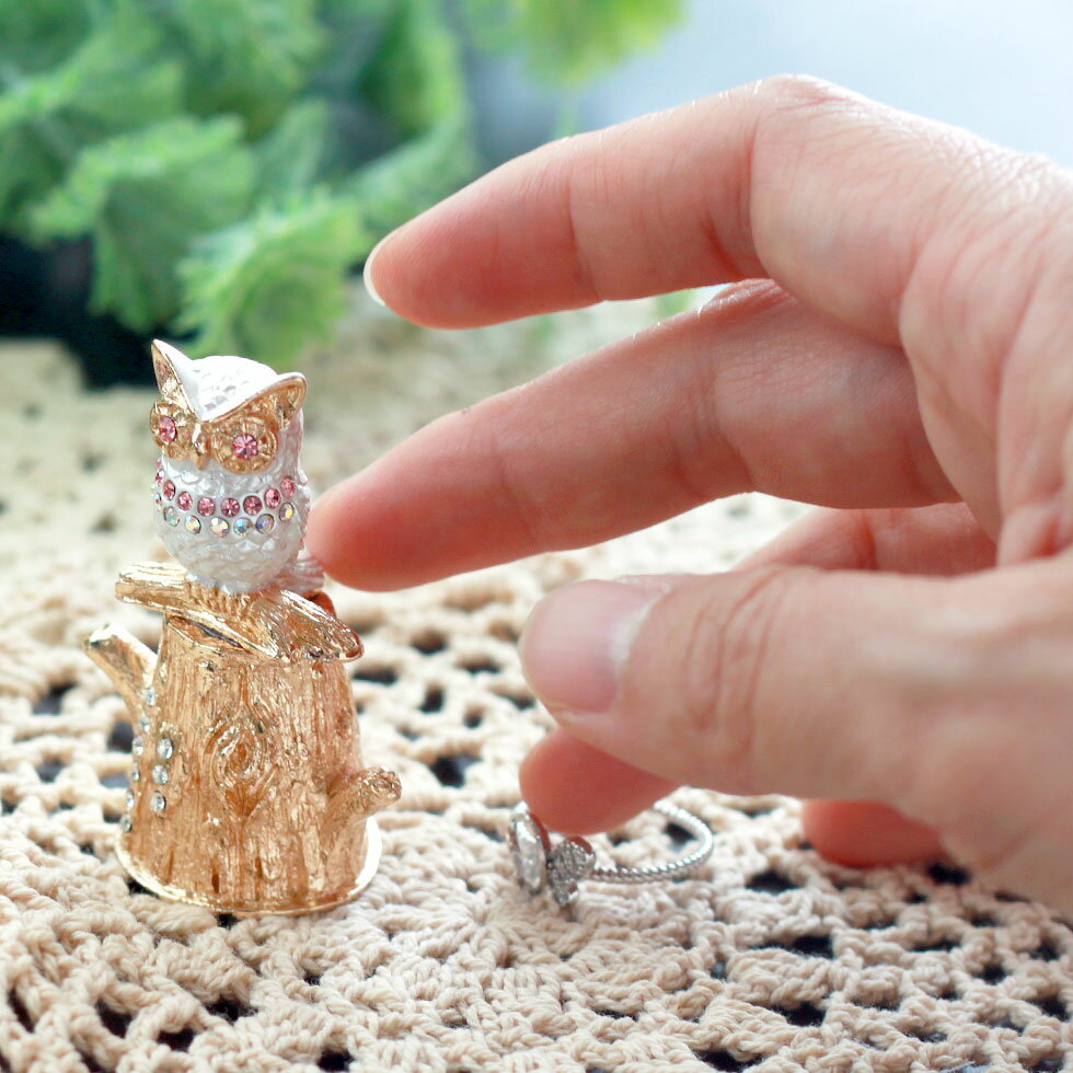 例)11号リングですと、フクロウと木の部分で止まります※ハンドメイド商品ですのでロットにより形状には多少の誤差があります※ジュエリーボックスのように開くタイプではありませんのでご注意ください 備 考・掲載画像は実物と同じ色合いを再現するようにしておりますが、PC環境等により若干異なる場合がございます。
